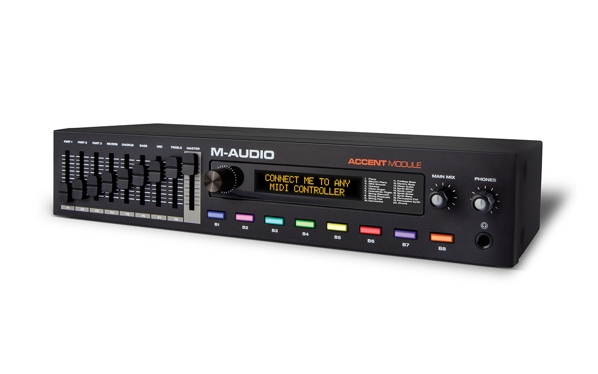When players want to convert their standalone MIDI controller into a stage piano, free from the restrictive encumbrance of a laptop computer, the M-Audio Accent Module is the perfect solution. This compact unit easily connects to any USB or 5-pin MIDI controller. With 20 built-in voices, it has the ability to split or layer two voices simultaneously, plus it includes the superb, world-renowned AIR Steinway Piano and AIR Structure VSTs.