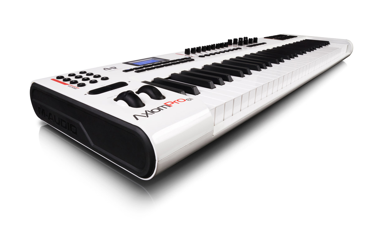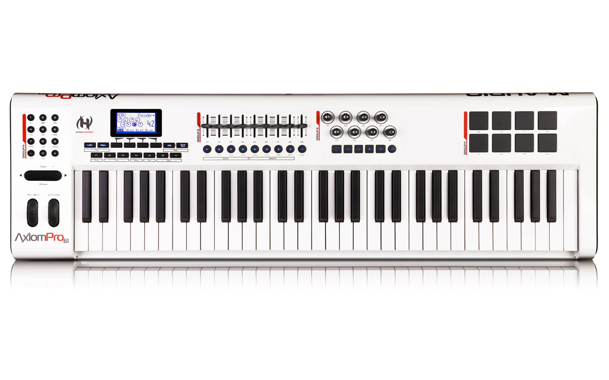 The M-Audio® Axiom® Pro 61 keyboard controller builds on the acclaimed Axiom 61 with premium TruTouch™ action, proprietary HyperControl™ MIDI mapping technology and other cutting-edge enhancements. HyperControl automatically maps the keyboard’s 65 controls to commonly accessed parameters in digital audio workstations including Pro Tools®, Cubase, Logic and Reason*, as well as software instruments. The constant two-way link with your host DAW means the keyboard’s controls are always in sync with your software’s active parameters. The intuitive graphic LCD constantly updates the current values, which ensures seamless editing and prevents parameter jumps—even when plug-ins are closed. Toggle instantly between Mixer and Instrument control modes. Map buttons to send QWERTY key commands right from the Axiom Pro 61. Save settings to 50 memory locations—each with four profiles of quick recall via the intuitive graphic LCD. Now you can control your entire session right from your Axiom Pro 61.