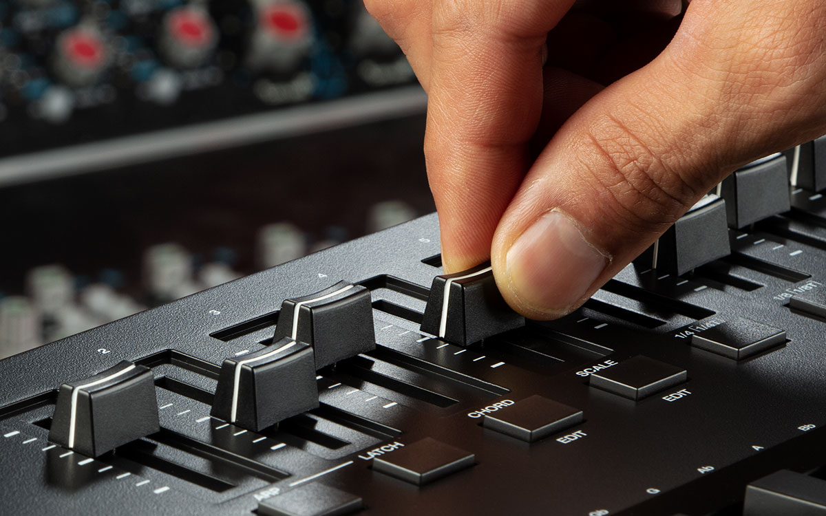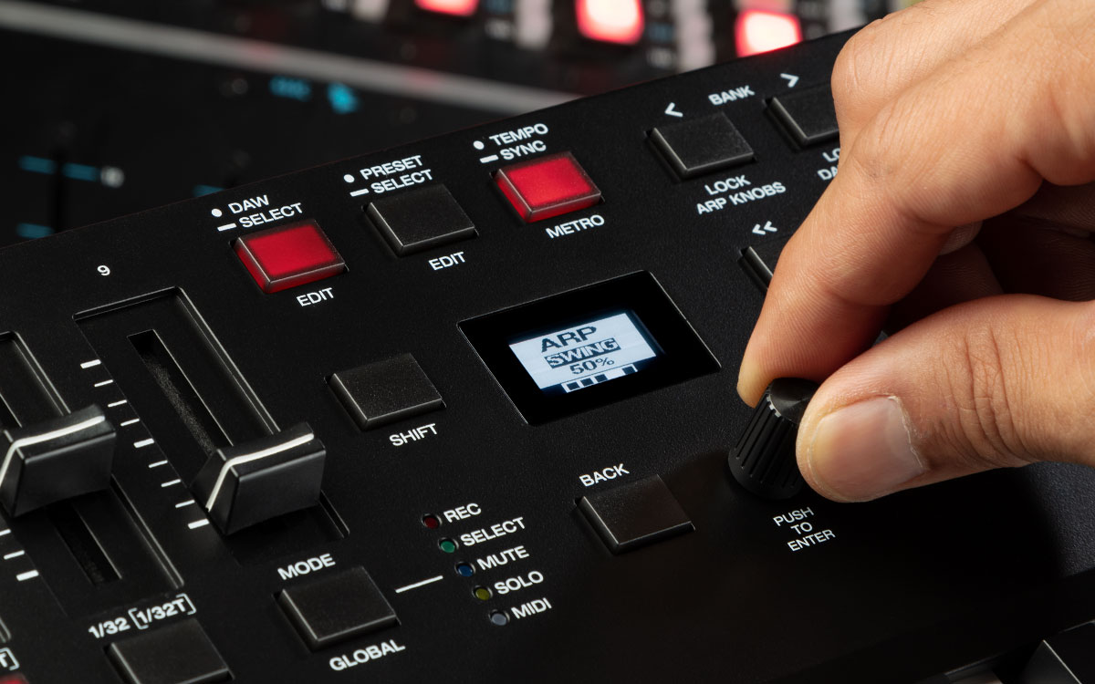 The built-in Arpeggiator will affect anything you are playing on the keys from any virtual instrument in your DAW. When the Arpeggiator is activated, the keyboard will repeatedly play the pressed keys in sequence. The arpeggiator’s timing and rhythm is based on the keyboard’s time division setting and either the keyboard’s or your DAW’s tempo setting. Each note in the arpeggio will be the length you’ve selected for the time division setting; for example, if you select 1/4, each note in the arpeggio will be a quarter note. This powerful tool can operate in Latch or Momentary mode, making it easy to unleash your creativity.