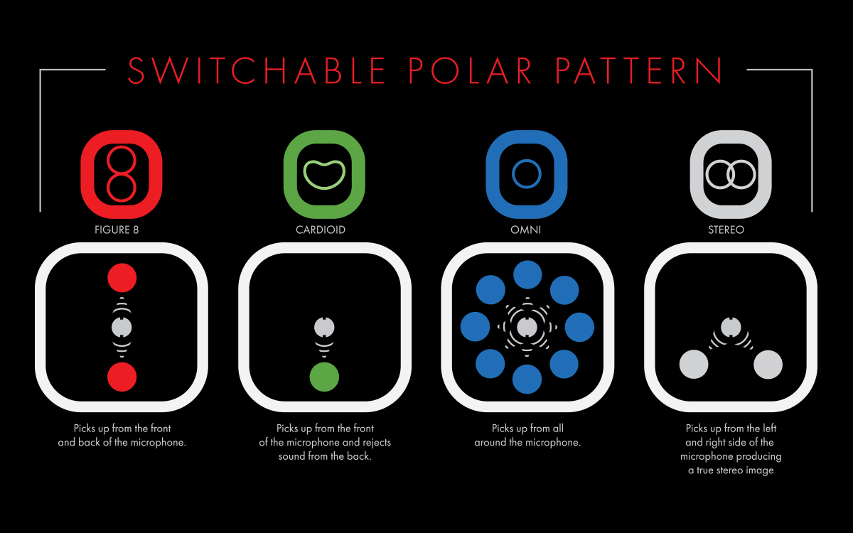 • Cardioid – a directional pattern, perfect for capturing singular sound sources while eliminating unwanted room reflections and background noise